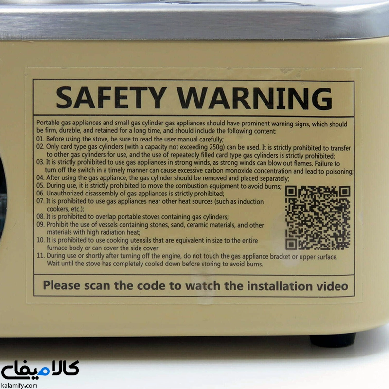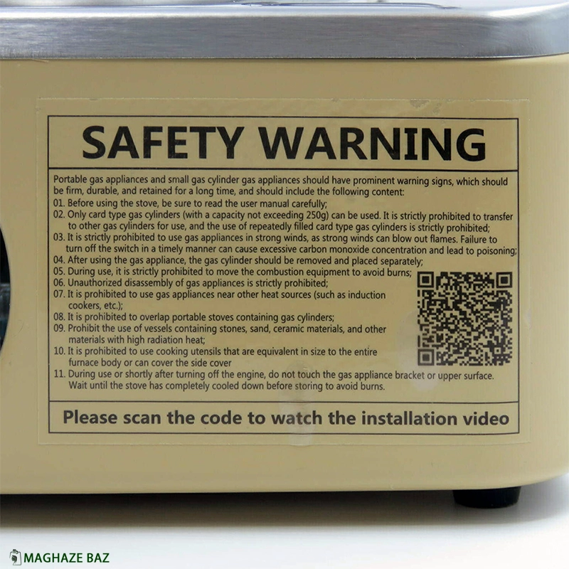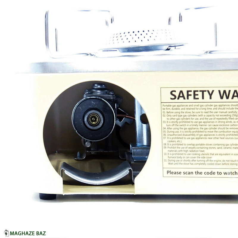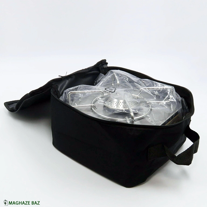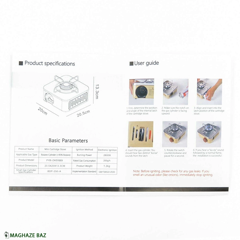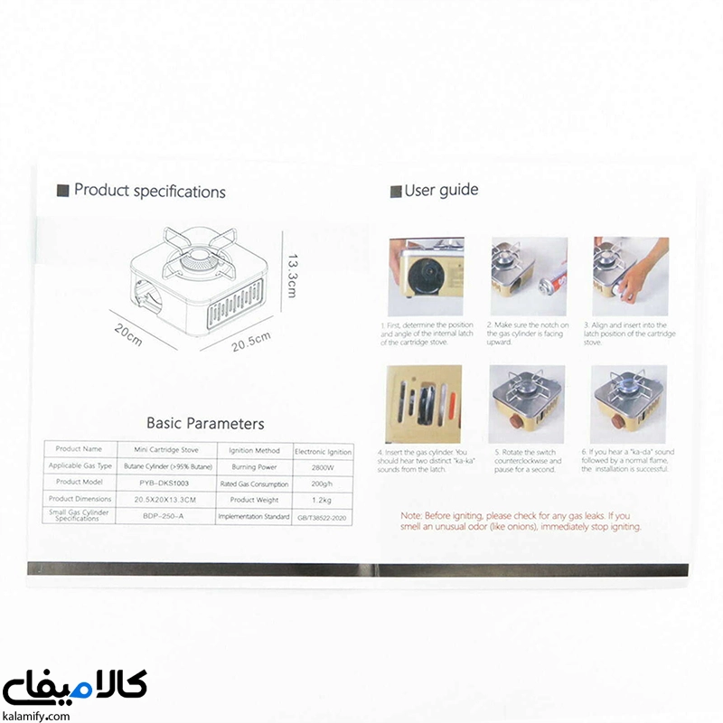 وزن:۱۲۰۰ گرم ابعاد:۲۱.۷×۱۳.۵×۲۱.۸ سانتیمتر میزان مصرف گاز:۲۰۰ گرم در ساعت جنس بدنه:استیل ضد زنگ تحمل وزن:۳۰ کیلو قدرت:۲۸۰۰ وات اقلام همراه:کیف برزنتی