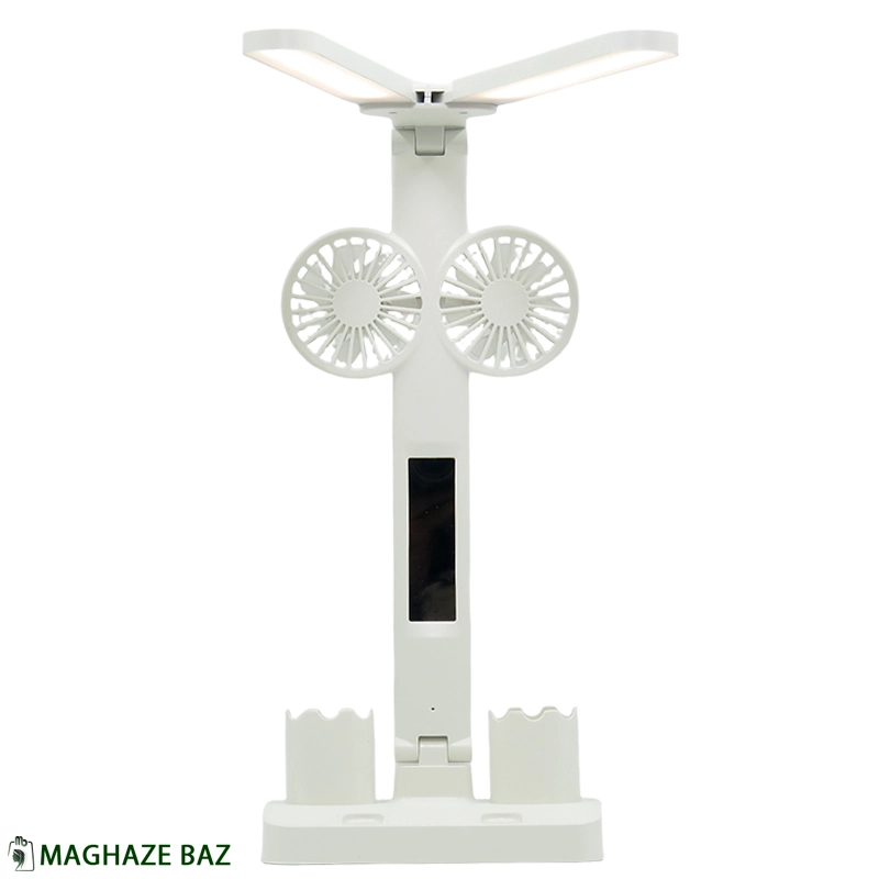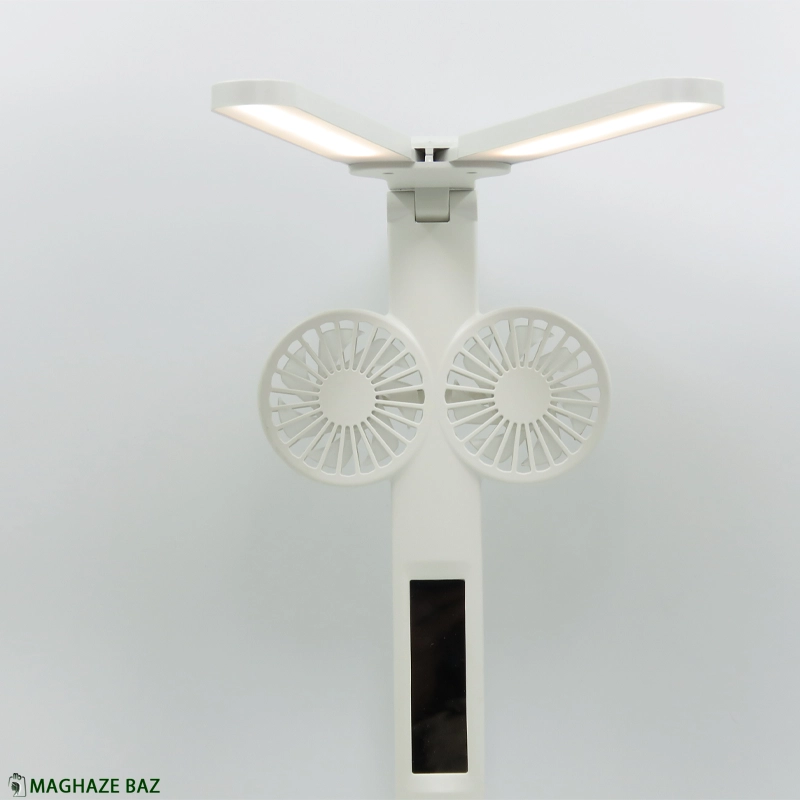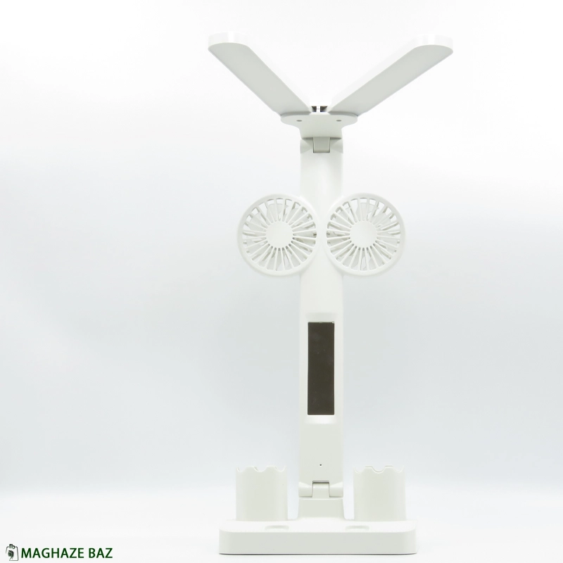 چراغ مطالعه تاشو چندکاره رومیزی 2LED فن، آیینه دار و شارژر USB